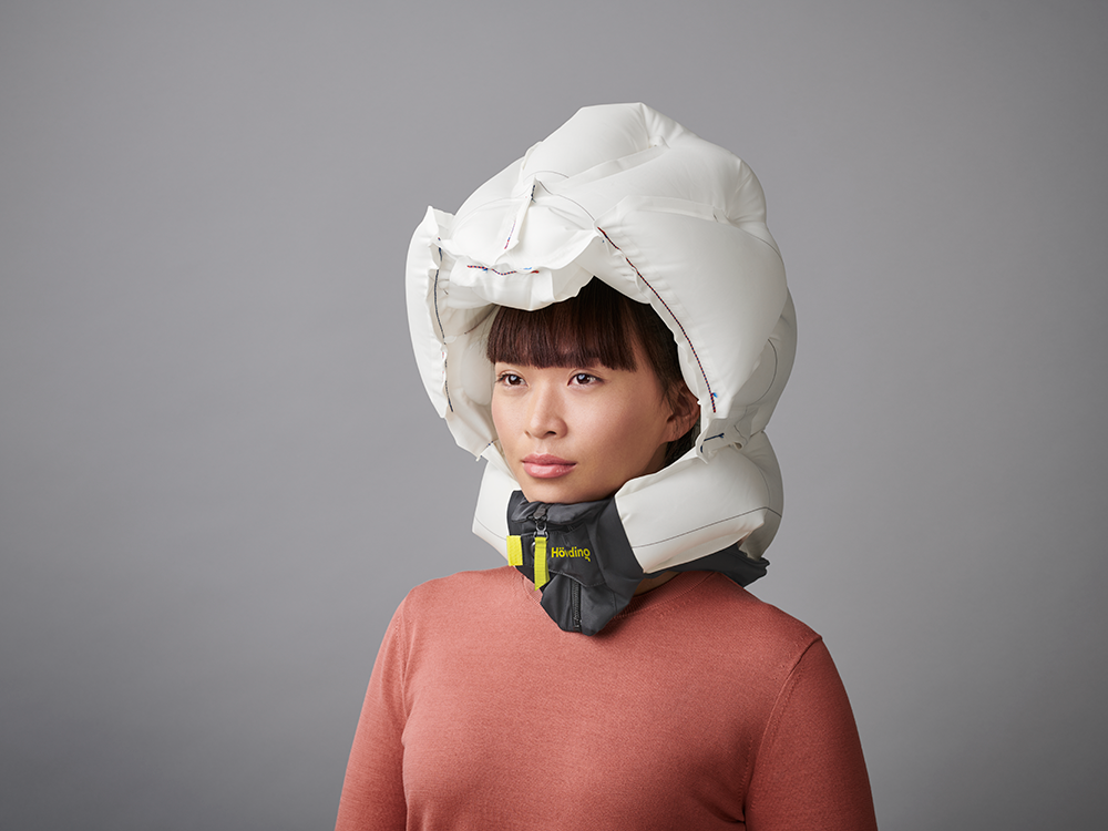 The Hövding is worn as a collar around the neck and remains invisible in everyday life – until it matters: In the event of an accident, the integrated sensor system recognizes the hazardous situation and triggers an airbag within milliseconds, which wraps around the head and neck like a protective hood.