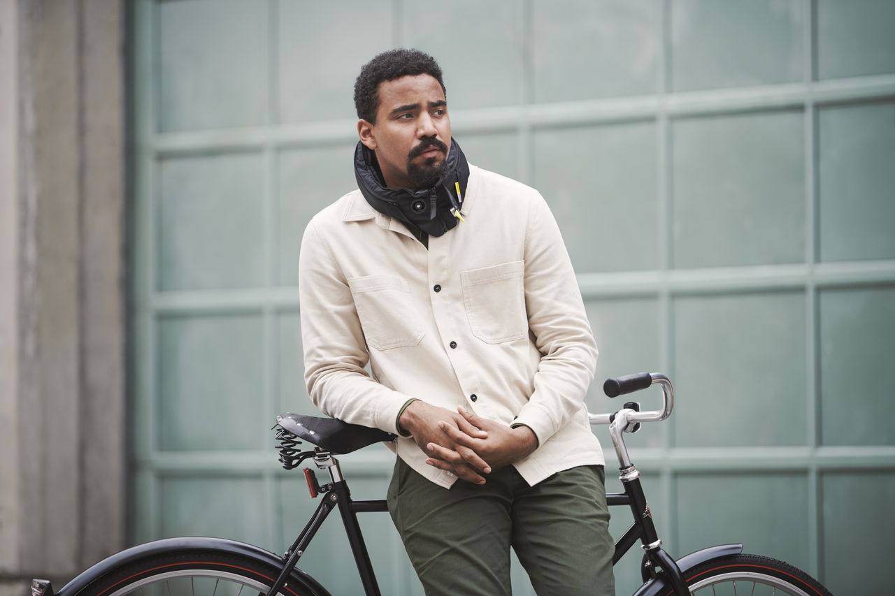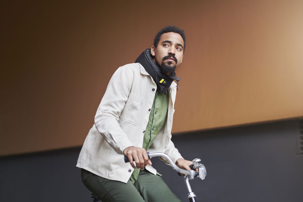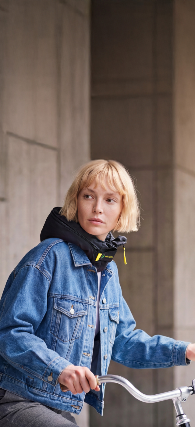 A collar, not a helmet. Hövding disappears into your outfit and your routine. No bulk, no helmet hair, just invisible protection.